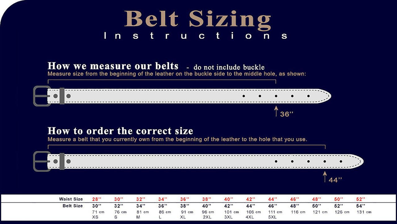• Our belts are measured from the fold where the buckle is attached to the middle hole. If you wanted to get the best size we recommend measuring a belt that works for you from the fold to the hole where you wear the belt.